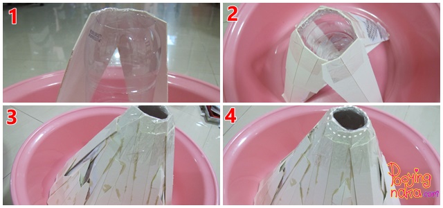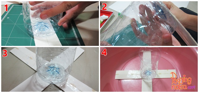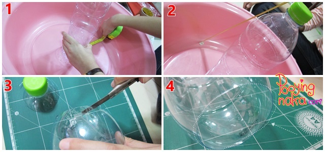 เราเริ่มด้วยการวัดขนาดเพื่อวางขวดน้ำไว้ตรงกลาง เราใช้กะละมังเป็นฐาน และตัดขวดน้ำด้านบนออกค่ะ