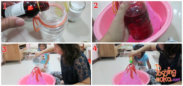 ขั้นแรกให้ผสมสีลงไปในน้ำส้มสายชูเสียก่อนค่ะ แล้วเติมน้ำอุ่นลงไปในปล่องภูเขาไฟของเรา แล้วตามด้วยน้ำยาล้างจาน