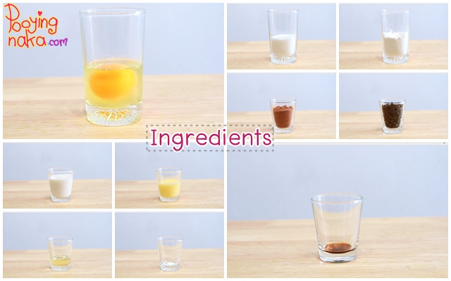 1. ผสม ไข่ไก่, น้ำตาลทราย, ผงโกโก้, น้ำมันพืช, เนยละลายและวานิลลา คนให้เข้ากันดี