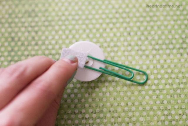 วิธีทำง่ายมากค่ะ เราจะยิงกาวร้อนลงไปที่ด้านหลังของกระดุมแล้วเอาคลิปหนีบกระดาษวาง จัดให้พอดีที่จะหนีบกระดาษได้ค่ะ แล้วเอาแผ่นกำมะหยี่ หรือถ้าไม่มีก็เป็นเศษผ้าสวยๆก็ได้ค่ะ (หนาหน่อยก็ดีนะคะ) เอาผ้ามาแปะทับกาวร้อน เพื่อให้กาวร้อนติดแน่นขึ้นแล้วก็ดูสวยงามมากขึ้นด้วยค่ะ