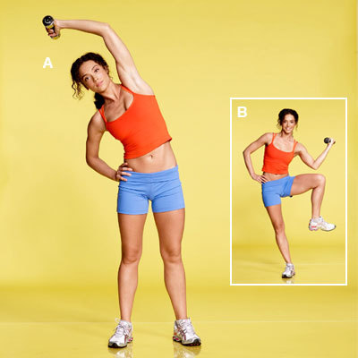 A. ให้ยืนแยกเท้าระดับที่กว้างกว่าสะโพกนิดหน่อย ทิ้งน้ำหนักไปที่ขาขวา และมือซ้ายถือดัมเบล์น้ำหนักตั้งแต่ 3-5 ปอนด์ยกขึ้นเหนือศรีษะ