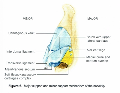โครงสร้างของจมูกด้านนอก ประกอบด้วย ด้านบนซึ่งเป็นกระดูกแข็ง และ ด้านล่างปลายจมูกที่ประกอบด้วยกระดูกอ่อน ( Lower Lateral Cartilage ) สองข้างซ้ายขวาซึ่งประกบกันตรงกลาง วางอยู่บนกระดูกอ่อนของผนังกั้นช่องจมูก ( Nasal Septum) ซึ่งกระดูกอ่อนปลายจมูกแต่ละข้างจะมีรูปทรงคลายตัว V คว่ำ โดยขาของของตัว V ด้านหนึ่งจะเรียงขนานกันตรงกลาง (medial crus) และส่วนขาตัวV อีกด้านจะส่วนที่เป็นโครงสร้างรูจมูกด้านหน้า (lateral crus)