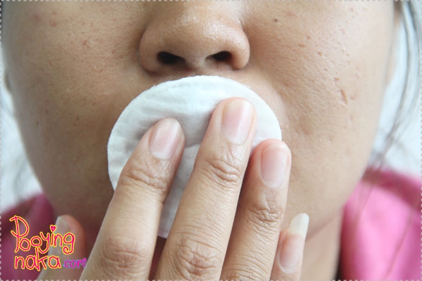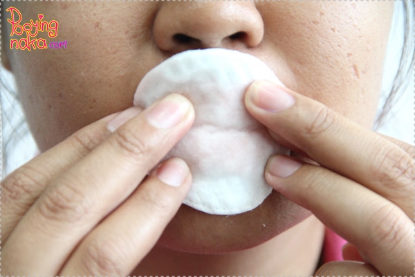 แล้วทำการเช็ดออกด้วย Sebum Control Cleansing water กดประมาณ 1-2 ปั้มก็ชุ่มไปทั้งสำลีแล้วค่ะ ทำการกดสำลีแช่ทิ้งไว้ที่ปาก สักครู่ แต่ระหว่างกดสำลีให้ถูวนๆ บริเวณปากของเราเพียงเล็กน้อย