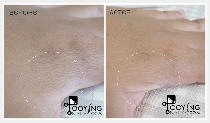 นอกจากลองที่หน้าแล้ว นกก็ลองที่มือด้วย นกไม่ได้ขยับมือตอนถ่ายรูปนะคะ จะเห็นว่ารอยผิวที่ย่นดูเรียบขึ้นค่ะ