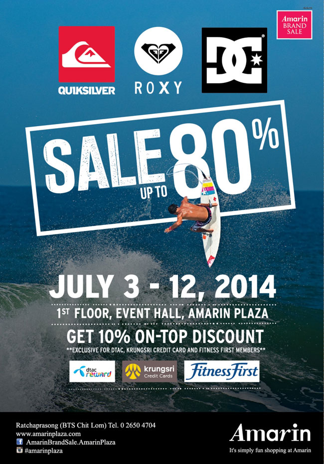 ร่วมช้อปจัดเต็ม ที่แม้แต่ฝนยังต้องยอมกับ Amarin Brand Sale: Quiksilver, Roxy & DC Sale โดยศูนย์การค้าอัมรินทร์ พลาซ่า หรือสอบถามข้อมูลเพิ่มเติมเข้าชมได้ที่ facebook.com/AmarinBrandSale.AmarinPlaza หรือโทร 0-2650-4704