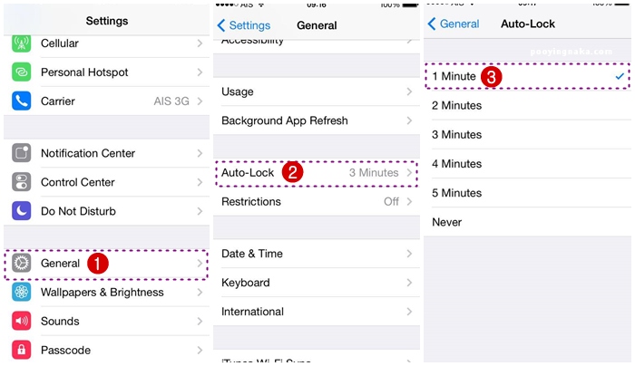 เมื่อเราใช้งานเสร็จให้กดปิดหน้าจอ โดยกดปุ่มด้านบนขวามือ เพื่อเป็นการประหยัดพลังงานที่จะโชว์หน้าจอของเรา หรือใช้วิธี Auto-Lock ให้เราเลือกระยะเวลาเอาค่ะ ถ้าเป็นไปได้ให้เลือกเป็น 1 นาที เข้าไปเซ็ทที่ Setting> General> Auto-Lock และเลือกเวลาค่ะ
