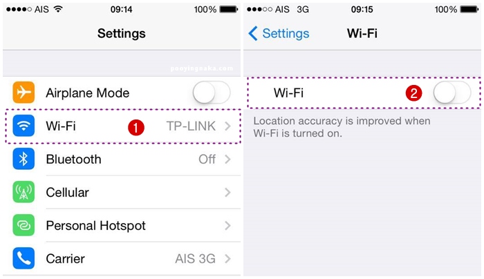 บางครั้งที่เราออกไปนอกบ้านก็ยังจำเป็นต้องใช้ Wi-Fi อยู่นะคะ แต่ให้เลือกใช้ Wi-Fi ที่เชื่อถือได้เท่านั้นนะคะ แต่ถ้าหากเป็นสถานที่ๆ Wi-Fi สัญญาณอ่อน หรือระหว่างเดินทาง แนะนำให้ปิดดีกว่าค่ะ เพราะมือถือเราจะคอยจับสัญญาณ Wi-Fi ที่เราเซ็ทเอาไว้ เป็นการสิ้นเปลืองแบตเตอรี่โดยใช่เหตุค่ะ วิธีปิดให้เข้าไปที่ Setting > Wi-Fi และเปิดใช้เมื่อถึงที่หมายค่ะ