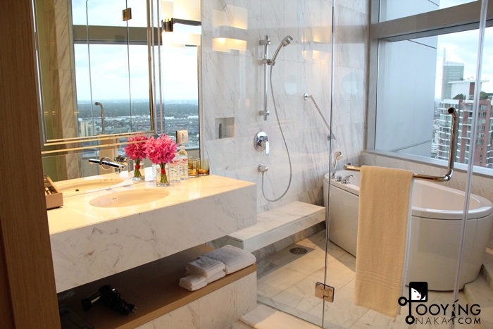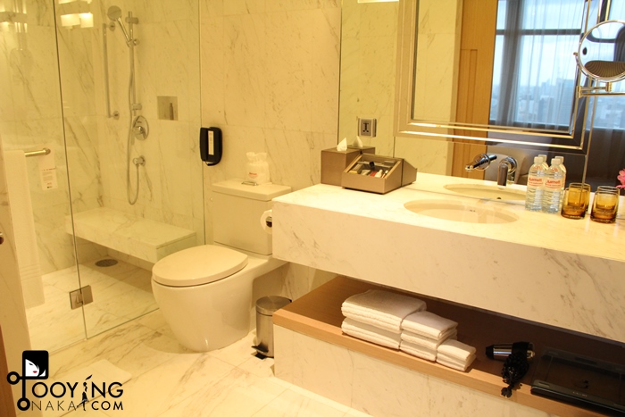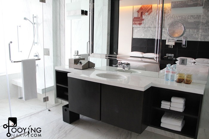 ส่วนของห้องน้ำนะคะ เห็นกระจกใสๆด้านข้างคือ ส่วนอาบน้ำนะคะ แต่เค้ามีประตูบานใหญ่กั้นระหว่างเตียงกับส่วนห้องน้ำค่ะ ฝั่งซ้ายเป็นโซนอาบน้ำและฝั่งขวาที่ไม่มีในรูปคือห้องสุขาค่ะ จะเป็นกระจกทึบ แต่ไม่มีกลอนปิดนะคะ แค่ว่าปิดประตูแล้วรู้กัน