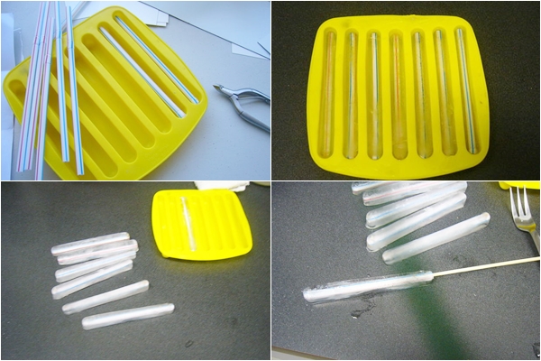 ให้เรานำหลอดดูดมาตัดให้ได้ขนาดพอดีกับถาด แล้วเอาน้ำใส่ แช่แข็งไว้ เมื่อได้ที่จะเอาหลอดออกปล่อยให้ละลายนิดนึงแล้วใช้ไม้จิ้มออกค่ะ