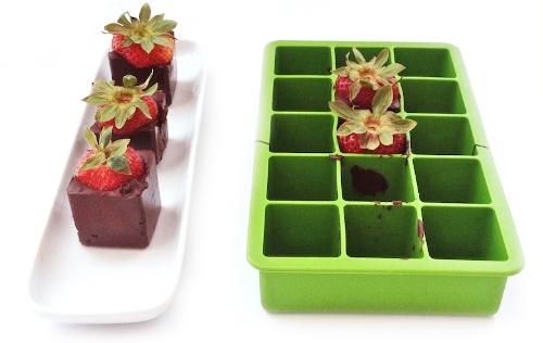 แล้วนำสตรอเบอร์รี่ใส่ไปในถาดแต่ละหลุด เทช็อคโกแลตลงไปแล้วนำไปแช่จนเซ็ทตัว นำมาเสิร์ฟได้ ดูมีทักษะการทำอาหารดีนะคะ