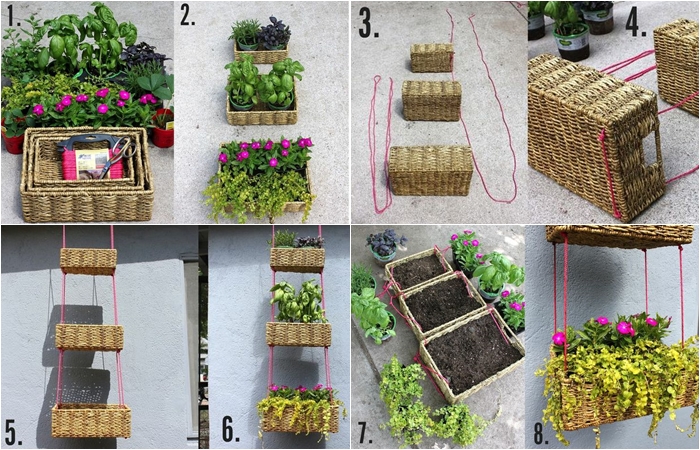 เราทำกระถางแขวนแบบนี้ได้ด้วยตะกร้าไม้หลายขนาดค่ะ ใช้เชือกที่แข็งแรงสักหน่อย แขวนให้ติดกับผนังค่ะ