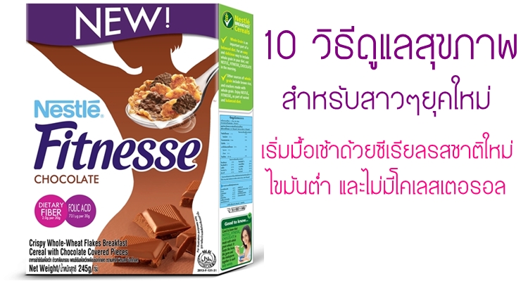 คุณผู้หญิงรู้สึกไหมคะว่า 24 ชั่วโมงในหนึ่งวัน แสนจะไม่พอ ตื่นเช้ามาก็ต้องแต่งตัวสวย เตรียมไปเฉิดฉายเดินแคทวอล์คในออฟฟิศ เลิกงานก็ต้องอัพเดทเทรนด์แฟชั่น แล้วก็ไปออกกำลังกาย ตกดึกก็นัดปาร์ตี้กับเพื่อนสาว ถึงแม้จะมีเวลาน้อย แต่สาวๆ ก็คงอยากได้อาหารเช้าที่ให้ประโยชน์ต่อร่างกายเพื่อเริ่มวันใหม่อย่างสดใสใช่ไหมล่ะคะ ลองอาหารเช้าซีเรียลรสชาติใหม่ เนสท์เล่ ฟิตเนสส์ ช็อกโกแลต ดูสิ ใช้เวลาเตรียมแค่ไม่กี่นาที นอกจากประโยชน์จากธัญพืชโฮลเกรนแล้ว ยังมีวิตามินบี2 บี6 และธาตุเหล็ก ได้อิ่มอร่อยเต็มคำกับรสช็อกโกแลตที่สาวๆโปรดปราน แต่ยังไขมันต่ำ และไม่มีโคเลสเตอรอลอีกด้วย ทานคู่กับโยเกิร์ตรสธรรมชาติและผลไม้ แค่นี้ก็เริ่มต้นวันอย่างมีคุณภาพแล้วล่ะคะ