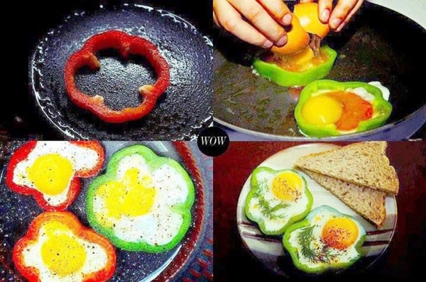 เราสามารถใช้ผักในครัวไม่ว่าจะเป็นพริกหวานหรือหอมหัวใหญ่มาเพื่อเป็นพิมพ์ทำไข่ดาว