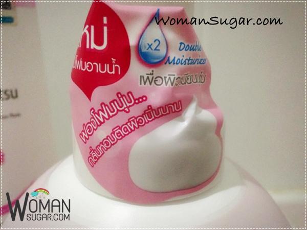 ตรงที่ปั๊มมีพลาสติกแปะไว้ว่า ฟองโฟมนุ่ม กลิ่นหอมติดผิวเนิ่นนาน x2 Double Moisturizer เพื่อผิวเนียนนุ่ม