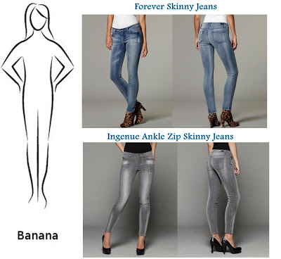 ควรเลือกยีนส์ดีไซน์ผู้หญิง ตกแต่งด้วยการเดินเส้นโค้ง สีสว่าง และไม่ควรมีกระเป๋ากางเกงเยอะๆทั้งนี้เพื่อเป็นการเสริมรูปร่างที่แบนราบของคุณให้ดูมีน้ำมีนวลขึ้น ที่สำคัญควรหลีกเลี่ยงยีนส์ทรงตรงแบบผู้ชาย เพราะจะยิ่งเน้นรูปร่างให้ดูแบนราบ