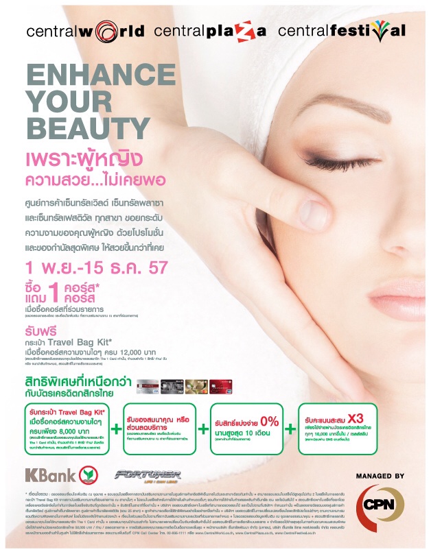 ศูนย์การค้าเซ็นทรัลพลาซา เซ็นทรัลเวิลด์ และเซ็นทรัลเฟสติวัล ทุกสาขา ขอยกระดับความงามของคุณผู้หญิงด้วยโปรโมชั่นและของกำนัลสุดพิเศษ ระหว่างวันที่ 1พ.ย. - 15 ธ.ค. 2557