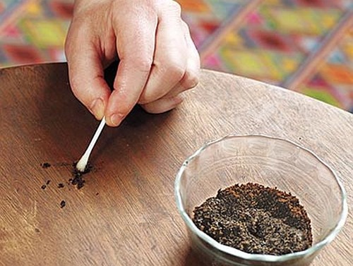 เฟอร์นิเจอร์ไม้ที่สีเข้มๆและแตกเป็นรู ให้ผสมกาแฟสัก 2-3 ช้อนโต๊ะเข้ากับน้ำเพียงเล็กน้อยให้ได้ลักษณะที่ข้นไม่เหลว ถ้าเป็นไม้โทนสีแดงให้เติมไอโอดีนเข้าไป จากนั้นนำไปป้ายในร่องที่แตกหรือที่เป็นรู และใช้ผ้าชื้นๆเช็ดรอบๆออกและปล่อยให้แห้งค่อยขัดผิวเฟอร์นิเจอร์ด้วยแว๊กซ์