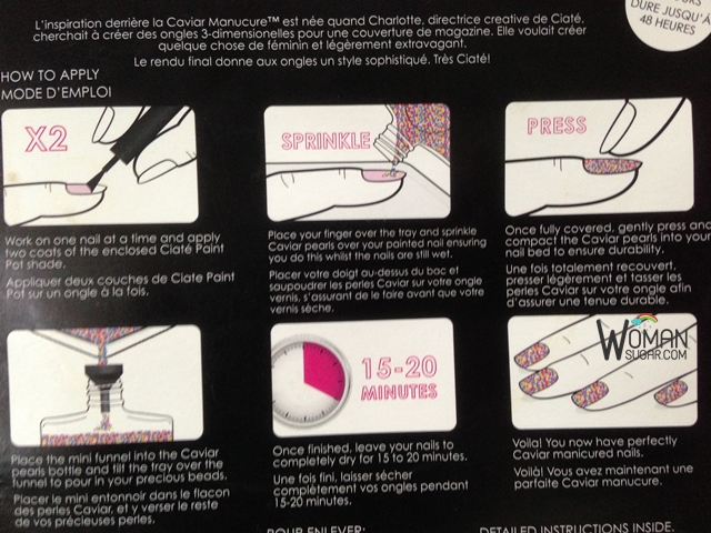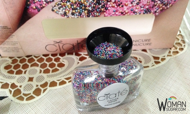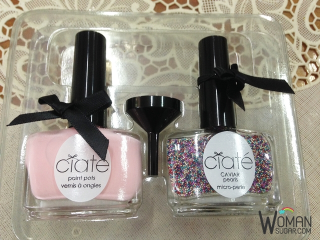 อุปกรณ์ในกล่องมียาทาเล็บสีชมพูอ่อน และเม็ดคาร์เวียร์หลากสี พร้อมกรวยเล็กๆและถาดสำหรับรองเม็ดคาร์เวียร์ค่ะ