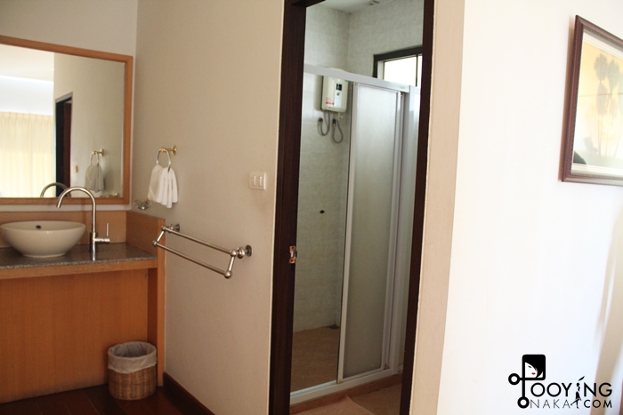 แปรงฟันล้างหน้าข้างนอก และด้านในเป็นห้องน้ำและห้องอาบน้ำ มีน้ำอุ่นและฝักบัว ไม่มีอ่างอาบน้ำค่ะ