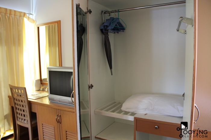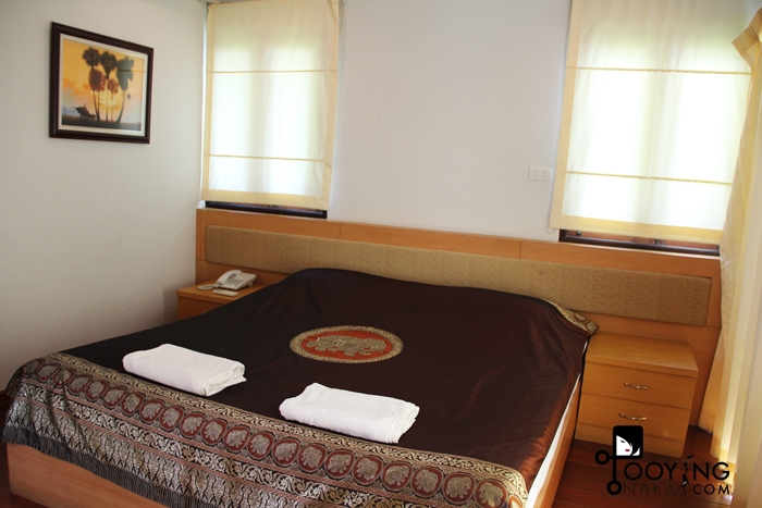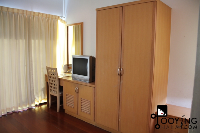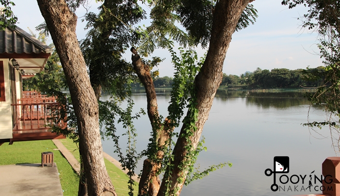 เนื่องจากแดดส่อง แดดแรง เราจึงไม่ได้เปิดม่านค่ะ เพราะแอร์คงสู้ความร้อนไม่ไหว ขอปิดม่านไว้ก่อน แต่หากเปิดม่านจะได้วิวบึงสวยงามมาก