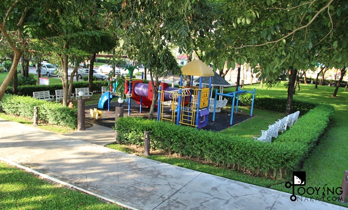 ตรงข้ามบ้านของเรามีสนามเด็กเล่น ใหญ่พอสมควรเลยล่ะ แต่ไม่ค่อยสะอาดเท่าไร เพราะคนเข้าพักทิ้งขยะกัน