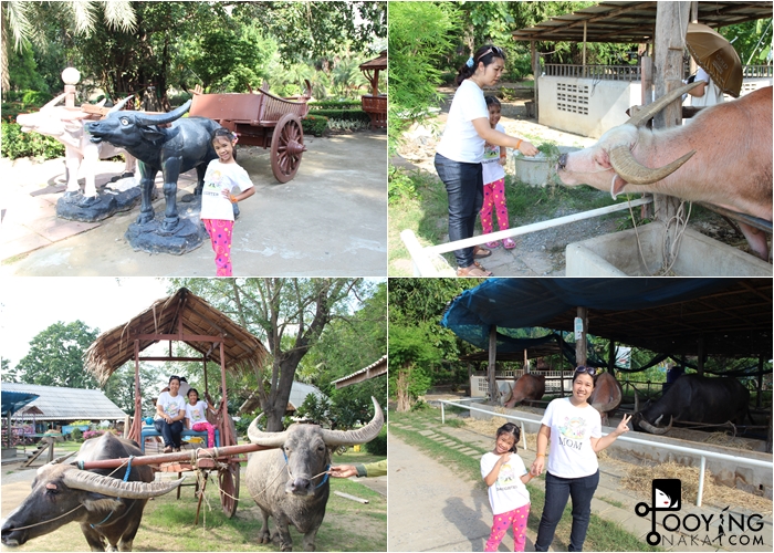 และเมื่อมาถึงสุพรรณบุรี การเรียนรู้ที่ดีอย่างหนึ่งก็คือการมาที่ หมู่บ้านอนุรักษ์ควายไทย (บ้านควาย) เด็กๆในเมืองอาจจะไม่ได้สัมผัสกับควายนัก เมื่อมาสถานที่แห่งนี้เราก็ต้องเดินๆๆๆ สามารถป้อนหญ้าเค้าได้ค่ะ และสามารถขี่เกวียนเทียมควายได้ด้วย พร้อมทั้งมีบ้านแบบโบราณให้เราได้ดู แต่จะขึ้นข้างบนก็ค่อนข้างน่ากลัวสักนิดนะ ถ้ามาทันรอบที่มีการทำนาโชว์ด้วยจะดีมากค่ะ แต่อย่างน้อยเราก็ได้นั่งเกวียน ที่นี่มีห้องพักด้วยนะคะ แต่เรามีที่พักในใจแล้ว ตอนนี้เริ่มเหนื่อยและล้ามากเพราะอากาศร้อน เราจึงได้เดินทางต่อไปยังที่พักของพวกเราค่ะ