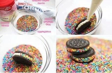 จากนั้นจุ่มโอรีโอทั้งชิ้นลงไปในไวท์ช็อคโกแลตแล้วนำไปใส่ของตกแต่งได้เลย