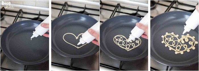 หลังจากผสมแพนเค้กสำเร็จรูปเสร็จแล้ว จัดการเทใส่ขวด แล้วบรรจงวาดลวดลาย แล้วปล่อยให้แพนเค้กสุก