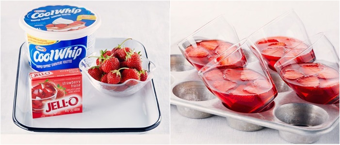 ใช้ Jell-O กับสตรอเบอร์รี่ทำเยลลี่ใส่สตรอเบอร์รี่จนเซ็ทตัวดีแล้วจัดการใส่วิปครีมตามลงไป แค่นี้ก็ฟินแล้วค่ะ