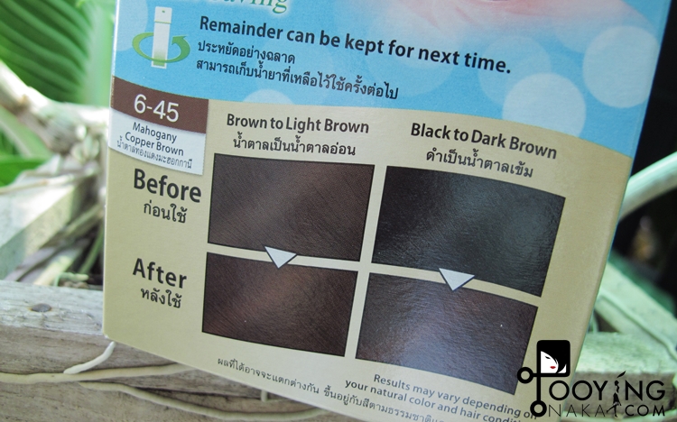 เลือกสี 6-45 Mahogany Copper Brown น้ำตาลทองแดงมะฮอกกานี เห็นสีผมที่กล่องสวยดี แต่ก็นั่นล่ะ จริงๆเป็นคนผมค่อนข้างดำ