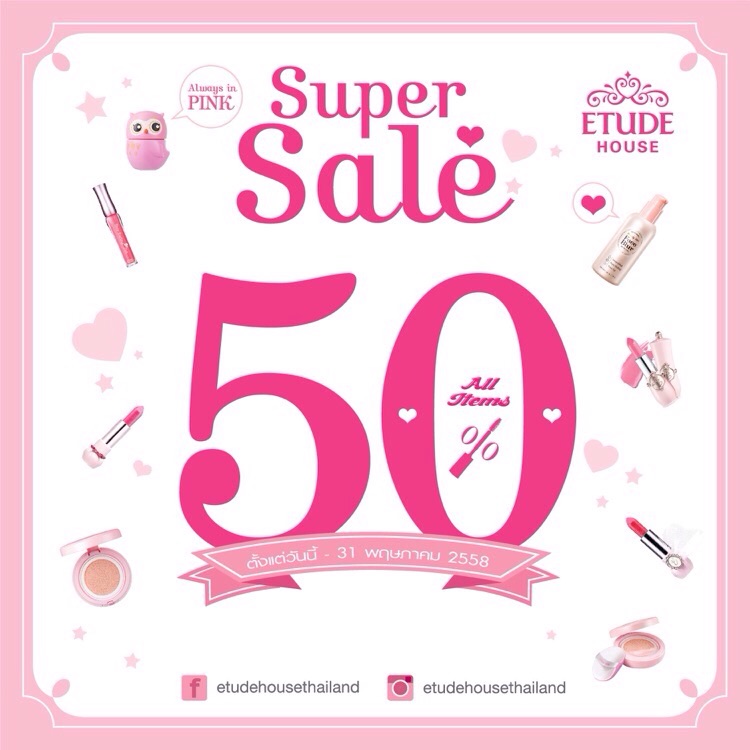 สาวๆจ๋า อีทูดี้ เฮ้าส์พร้อมส่งต่อความสวยด้วยโปรโมชั่นสุดพิเศษ  ซุปเปอร์เซล ลดราคา 50จากราคาปกติทุกชิ้น ทุกรายการ ตั้งแต่วันนี้ – 31 พฤษภาคม 2558 ที่อีทูดี้ เฮ้าส์ เครือเดอะมอลล์ทุกสาขาและ พารากอน เคาน์เตอร์เซ็นทรัลสาขาลาดพร้าวและพัทยา  stand alone shop ทุกสาขา ยกเว้น ซีคอนบางแค ....สาวก อีทูดี้ เฮ้าส์ ไม่ควรพลาดนะจ๊ะ #EtudeHouseSuperSale50Percentoff #EtudeHouseThailand @EtudeHouseThailand