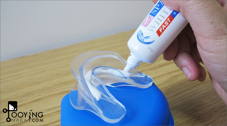 วิธีทำก็คือ บีบเจลฟอกฟันขาวลงไปทั้งสองด้านของที่ครอบฟันค่ะ กะปริมาณอย่าให้มากเกินไปค่ะ