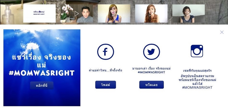 Mom Was Right คำของแม่...จริงเสมอ จะมีเรื่องราว, คำแนะนำต่างๆของแม่ที่ช่วยเพิ่มพลังในตัวเรา ทำให้เราผ่านเรื่องราวต่างๆในชีวิตไม่ว่าจะเป็นความยากลำบาก หรืออุปสรรคต่างๆนั้นมาได้ สำหรับประเทศไทยนั้น จะมี 4 บล็อกเกอร์ชื่อดัง ได้แก่ คุณกุ้ง อินเตอร์, ป้าพิม, Momybowy และน้องแก้ว Lifestylehattaya70 มาบอกเล่าเรื่องราวที่คุณแม่คอยพร่ำสอนแต่พวกเขากลับไม่เคยใส่ใจ ความแตกต่างจากเรื่องราวของทั้ง 4 คนนั้นหลากหลาย แต่ทั้งหมดมีสิ่งเดียวที่เหมือนกันนั่นก็คือ...คำของแม่จริงเสมอ