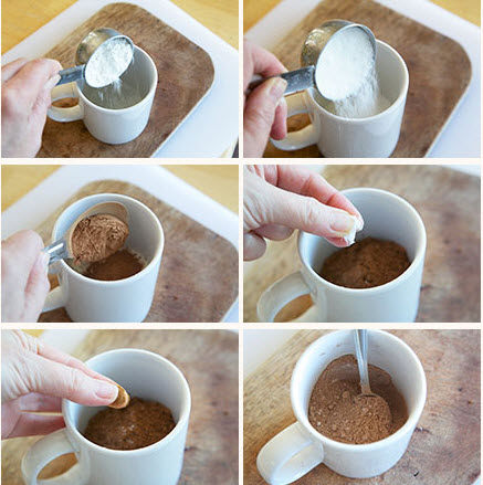 ใส่แป้ง, น้ำตาล, ผงโกโก้, เกลือ (ในสูตรใส่ผงอบเชยด้วย จะใส่หรือไม่ก็ได้แล้วแต่ชอบ) คนให้เข้ากัน