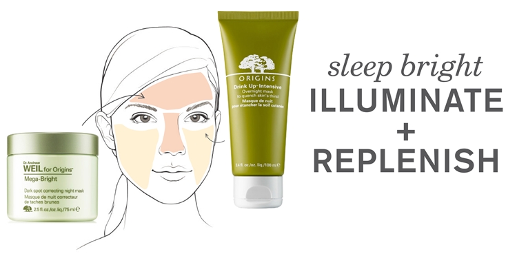 จะใช้ Dr. Andrew Weil for Origins Mega-Bright  Dark Spot Correcting Night Mask ซึ่งเป็นมาส์กที่ไม่ต้องล้างออกแต่หากจะใช้ร่วมกับมาส์กตัวอื่นก็ได้เช่นกัน สูตรนี้เพื่อความสดใสค่ะ ให้ทาช่วงหน้าผากและบริเวณจมูก ส่วน Drink Up Intensive Overnight Mask จะให้ความชุ่มชื้นกับผิว ให้ทาช่วงบริเวณแก้ม