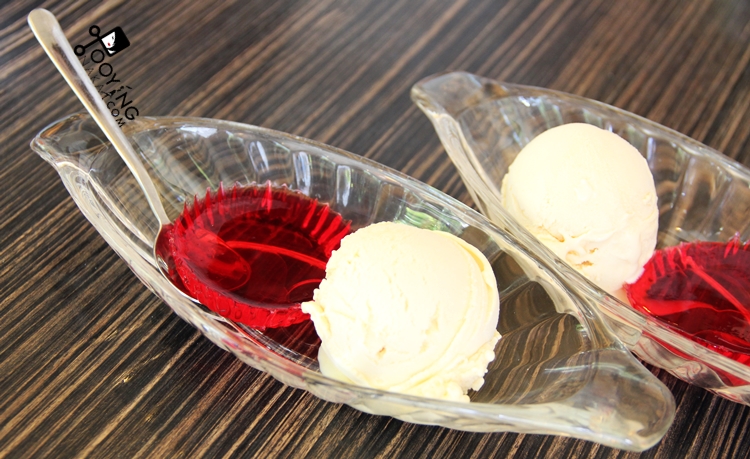 ไอศกรีมวนิลลากับเยลลี่ วานิลลาที่นี่ไม่ใช้วานิลลาสังเคราะห์ด้วยนะคะ จากฝักวานิลลาเลยล่ะ