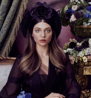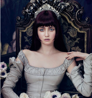 สำหรับสไตล์สร้างกรอบหน้านี้ สีผมเป็นดั่งมงกุฎเพชรที่เปล่งแสงกระจ่าง ในสีมาฮอกกานีเข้มและม่วงอเมธิสต์ ยูจิ กล่าว่า เขาได้รับแรงบันดาลใจมาจากผิวของนางแบบที่ขาวดุจหิมะ "ผมอยากสร้างลุคขุนนางสูงศักดิ์ให้กับเธอ ดังนั้น ผมจึงเลือกใช้สีม่วง สีม่วงเป็นสัญลักษณ์ของตระกูลขุนนางในประเทศญี่ปุ่น และรู้จักกันดีว่าเป็นสีที่ได้รับการยกย่อง ให้ประกายเงางามอย่างสมบูรณ์แบบดั่งที่คุณต้องการ"