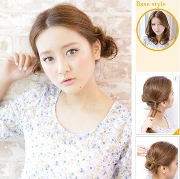 ก่อนอื่นนหวีผมให้เรียบ แบ่งผมครึ่งศรีษะแล้วม้วนเข้าจนได้ทรง จากนั้นใช้กิ๊ปตัวใหญ่ติด