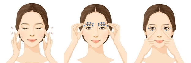 1. หลับตาจากนั้นใช้ให้นิ้วกลางและนิ้วนางกดคลึงบริเวณขมับ ขึ้นลงสลับกันไปมาอย่างเบามือ ทำซ้ำกัน 3-4 ครั้ง