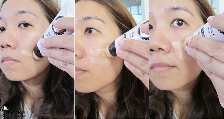 ค่อยๆเกลี่ยๆและกดเบาๆให้ทั่วใบหน้าค่ะ พยายามอย่าให้เนื้อ CC ออกมาเยอะไม่งั้นจะดูไม่เป็นงานผิวและอาจเป็นคราบได้