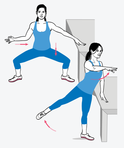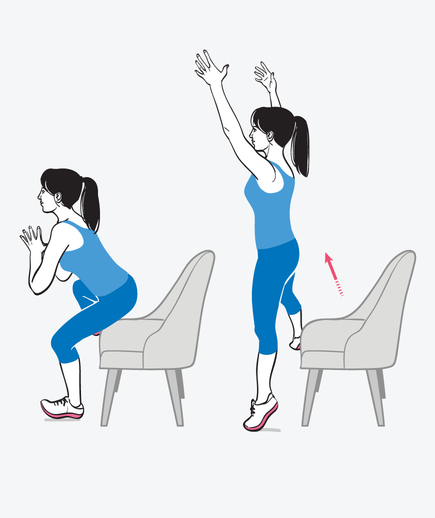ยืนอยู่ด้านหน้าเก้าอี้ ขากางกว้างออก ส้นเท้าแตะพื้นแต่นิ้วยกขึ้น จากนั้นให้งอเข่าลงและย่อตัวลง ไม่ต้องถึงกับนั่งกับเก้าอี้แต่ให้ใกล้เคีย
