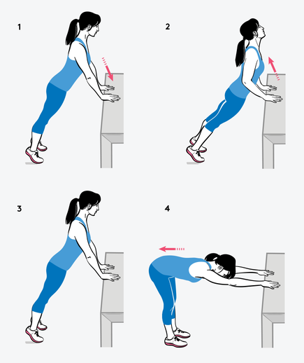 ให้เอามือค้ำที่โต๊ะ ยืนห้างออกจากโต๊ะประมาณ 2 ฟุต ส้นเท้ายกขึ้น จากนั้นย่อข้อศอกลง พร้อมกับยืดหน้าอก หลังงอเล็กน้อย