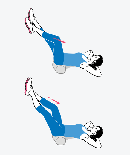นอนราบกับพื้นโดยมีหมอนใบเล็กรองไว้บริเวณสะโพก มือทั้งสองประสานอยู่ท้ายทอย เหยียดขาขึ้นจนรู้สึกตึง