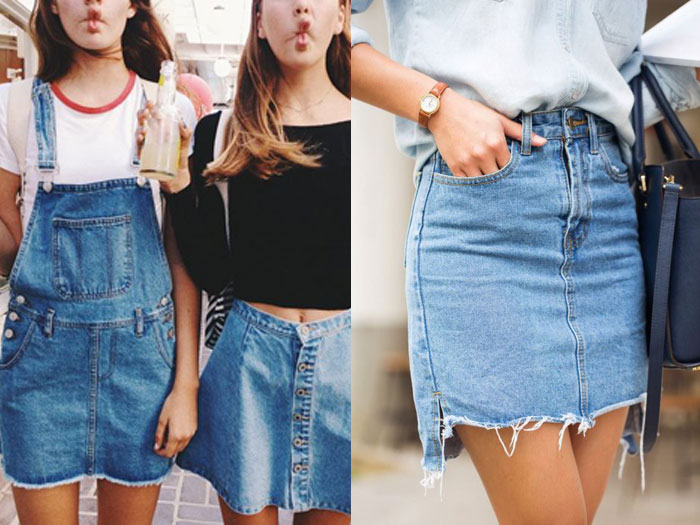 กระโปรงยีนส์เอวสูงจะทรงสอบหรือทรงเอก็ได้ทั้งนั้น แม้กระทั่งชุดเอี๊ยมก็น่ารัก แค่นำมาจับคู่กับเสื้อยืดแขนสั้นหรือแขนยาวสีพื้นๆ อย่างสีขาว สีฟ้าอ่อน สีครีม หรือสีดำ ก็ช่วยให้สาวๆดูดีขึ้นได้แบบไม่เยอะจนเกินไป ขอบอกไว้ก่อนว่าตอนนี้คนยังอินกับกระโปรงยีนส์เอวสูงอยู่นะคะ ถ้าคิดจะสวมยีนส์เอวต่ำล่ะก็ อาจจะต้องจับคู่ดีๆนะ ไม่งั้นเดี๋ยวจะตกเทรนด์ไม่รู้ตัว
