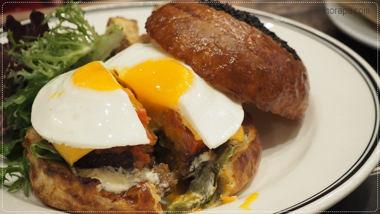 อย่างที่เราเห็น จะมีไข่ดาวโปะมาด้านบน พร้อมเชดด้าชีส มะเขือเทศ เนื้อแองกัสชุ่มๆชิ้นหนาๆและผักกาดพร้อมซอส