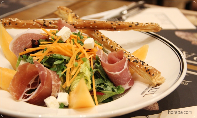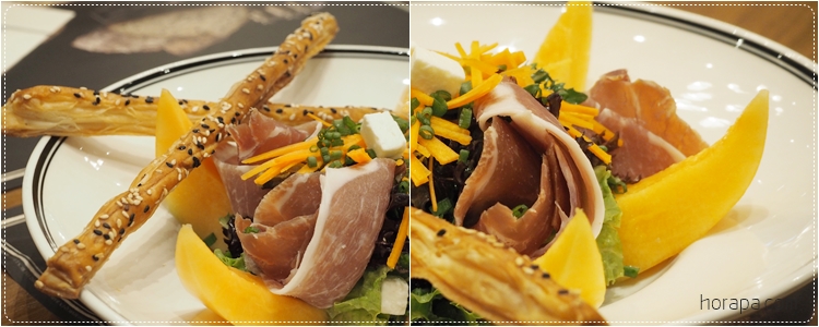 สลัดเมลอนค่ะ พอมาเสิร์ฟเท่านั้นแหละ บอกเลยว่าถูกใจมาก เพราะอากาศค่อนข้างร้อน กินสลัดจะสดชื่นมากๆ