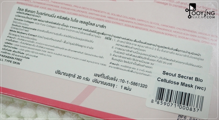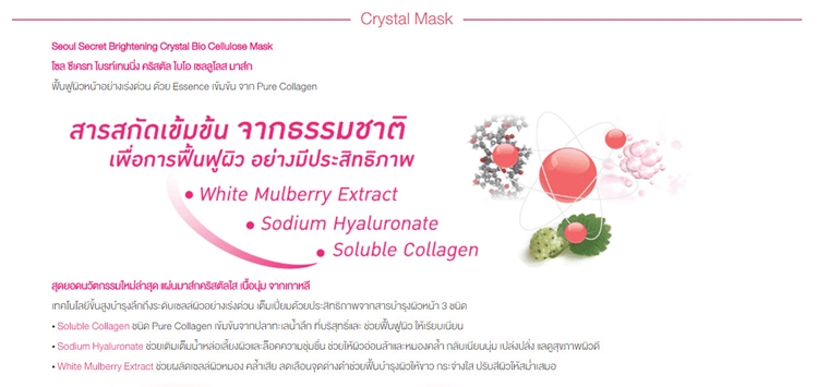 โซล ซีเครท ขอแนะนำ โซล ซีเครท ไบรท์เทนนิ่ง คริสตัล ไบโอ เซลลูโลส มาส์ก (Seoul Secret Brightening Crystal Bio Cellulose Mask) ปฏิวัติวงการมาสก์กับครั้งแรกของสุดยอดแผ่นมาส์กคริสตัลใส เนื้อนุ่ม นวัตกรรมเคาน์เตอร์แบรนด์ส่งตรงจากเกาหลี เทคโนโลยีขั้นสูงในการกระจายสารลงสู่ผิวหน้าได้รวดเร็วที่สุดของนวัตกรรมมาส์กคริสตัลใส บำรุงลึกด้วยเอสเซนส์เข้มข้นฉ่ำทั่วเนื้อมาส์ก ซึมลงสู่ผิวทั่วใบหน้า ยืดหยุ่นและแนบสนิท เนื้อมาส์กให้ความชุ่มชื่นจากน้ำ 95% ทำให้รู้สึกเย็นสบาย ผ่อนคลาย ช่วยลอกสิวเสี้ยนและเซลล์ผิวหนังที่ตายแล้วให้หลุดออก ทางลัดเพื่อฟื้นฟูเร่งด่วนสู่ผิวหน้ากระจ่างใส เปล่งประกายดุจคริสตัล ผลิตจากวัตถุดิบธรรมชาติ ด้วยประสิทธิภาพจากสารบำรุงผิวหน้า 3 ชนิด ได้แก่ Soluble Collagen ชนิด Pure Collagen เข้มข้นจากปลาทะเลน้ำลึกช่วยฟื้นฟูผิวให้เรียบเนียน Sodium Hyaluronate ช่วยเติมเต็มน้ำหล่อเลี้ยงผิวและล็อคความชุ่มชื่น ช่วยให้ผิวอ่อนล้าและหมองคล้ำ กลับเนียนนุ่ม เปล่งปลั่ง แลดูสุขภาพผิวดี และ White Mulberry Extract ช่วยผลัดเซลล์ผิวหมอง คล้ำเสีย ลดเลือนจุดด่างดำช่วยฟื้นบำรุงผิวให้ขาว กระจ่างใส ปรับสีผิวให้สม่ำเสมอ เหมาะสำหรับผู้ที่ต้องการฟื้นฟูผิวหน้าที่อ่อนล้ามาทั้งวันจากการทำงานหรือเผชิญกับมลภาวะอย่างเร่งด่วน หรือต้องการบำรุงผิวหน้าก่อนการแต่งหน้า เพื่อเมคอัพติดทนนาน