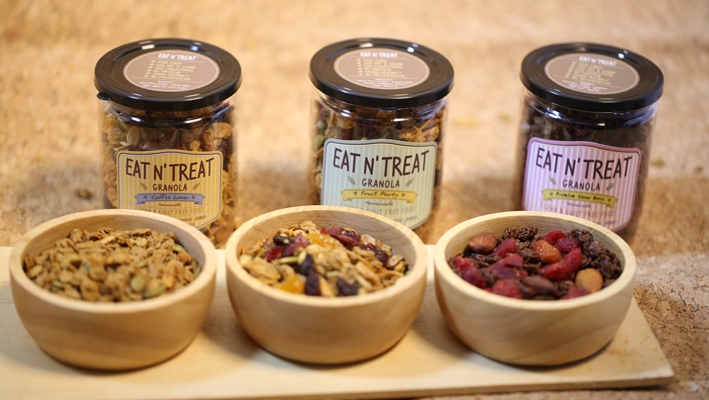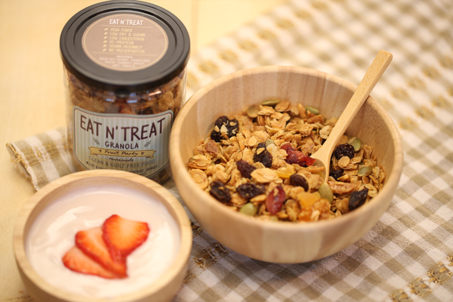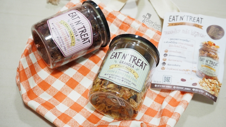 จากแนวคิดที่เชื่อว่า การกินขนม คือ การบำบัดอารมณ์ และสุขภาพ Eat and Treat Granola (อีท แอนด์ ทรีท กราโนล่า ) จึงถือกำเนิดขึ้นมา ให้ทุกคำที่รับประทาน มากไปด้วยคุณค่า แต่ยังคงความอร่อย เป็นขนมที่ทานมากได้โดยไม่รู้สึกผิด เวลาเหนื่อยเครียด หิว ไม่ต้องคิดมากถ้าจะเอาเข้าปาก ( Guilt free Snack ) ด้วยคุณภาพระดับพรีเมี่ยม กรรมวิธีกรรมวิธีการผลิตที่สะอาด พิถีพิถันและใส่ใจในทุกขั้นตอน ทำให้ได้กราโนล่าที่หอม กรอบ อร่อย กลมกล่อม หวานน้อย อบใหม่ๆจากเตาทุกวัน มากด้วยประโยชน์จากส่วนผสมที่คัดคุณภาพ มี 3 รสชาติ