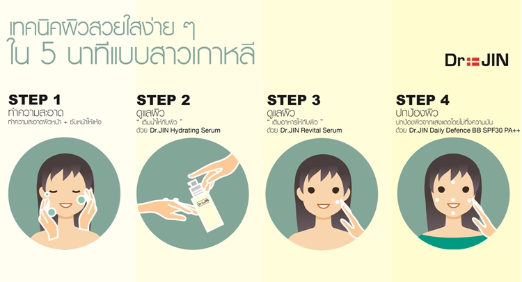 วันนี้ Dr.Jin (ด็อกเตอร์จิน) แบรนด์เวชสำอางทรงประสิทธิภาพ จากประเทศเกาหลี ที่คิดค้นขึ้นมาจาก “วิทยาศาสตร์ธรรมชาติ” โดยวอนจิน ไบโอเฮลท์แคร์ ภายใต้ความเชื่อที่ว่า “ความงามที่แท้จริง มาจากผิวที่มีสุขภาพดี” ช่วยแก้ไขปัญหาผิวที่เกิดขึ้นให้ผิวกลับมาแข็งแรง พร้อมเผยผิวสวยด้วยผลิตภัณฑ์บำรุงผิว Dr.JIN กับเคล็ดลับง่าย ๆในวันที่เร่งรีบและไม่มีเวลาโบกงานผิวมากนัก สาวๆ ลองดูกันนะคะ "เทคนิคผิวสวยใสง่ายๆ ใน 5 นาที แบบสาวเกาหลี” เพียงเท่านี้คุณก็มีผิวเนียนใส ชุ่มชื่น ฉ่ำน้ำ พร้อมเผยผิวสดดั่งสาวเกาหลีอย่างมั่นใจ