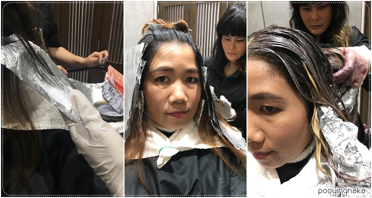 ผมนกเป็นสีน้ำตาล ซึ่งทำสีสดไม่ได้จึงต้องล้างสีเสียก่อน ก็ใช้เวลาพอสมควรเลยค่ะเพราะล้างเป็นช่อๆ